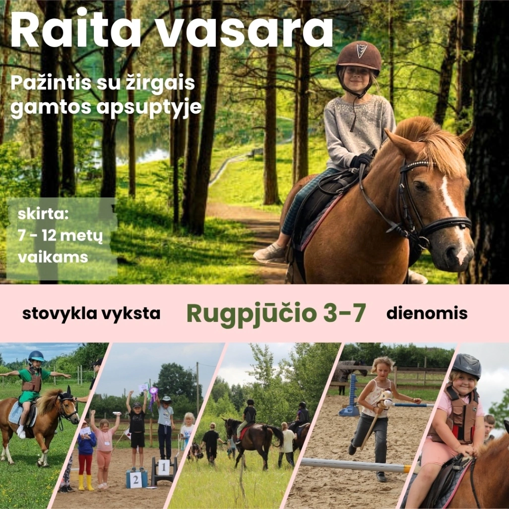 “Raita vasara” tai aktyvi vaikų vasaros stovykla 2026, puikiai padedanti patirti nuotykių gamtoje, būti fiziškai aktyviam, susirasti naujų draugų, išbandyti naujas veiklas, įgyti savarankiškumo, pasitikėjimo savimi, bendravimo bei bendradarbiavimo įgūdžių. Stovyklos metu gyvensime nuostabiame gamtos kampelyje „Gynios slėnyje”. Be įprastų stovyklos veiklų, vaikams suteiksime galimybę išbandyti unikalią programą su žirgais. Vaikai turės progą susipažinti su jų pasauliu, išmokti rūpintis šiais nuostabiais gyvūnais ir suprasti jų elgesį bei poreikius. Kiekvienas vaikas turės galimybę artimai pažinti žirgą, išmokti juo rūpintis, valyti, šerti ir, žinoma, stebėti bei dalyvauti kasdienėje žirgų priežiūroje. Ši vaikų vasaros stovykla Lietuvoje ne tik suteiks vaikams žinių apie žirgų priežiūrą, bet ir padės ugdyti atsakomybę, kantrybę ir empatiją, o bendravimas su žirgais prisidės prie emocinės gerovės ir pasitikėjimo savimi. Stovyklos dalyviai taip pat išbandys jojimą žirgais kartu su kvalifikuotais treneriais.